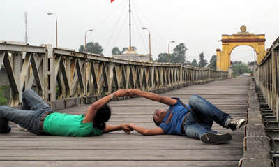 Thanh-Hải đang trình diễn trên cầu Hiền Lương. |