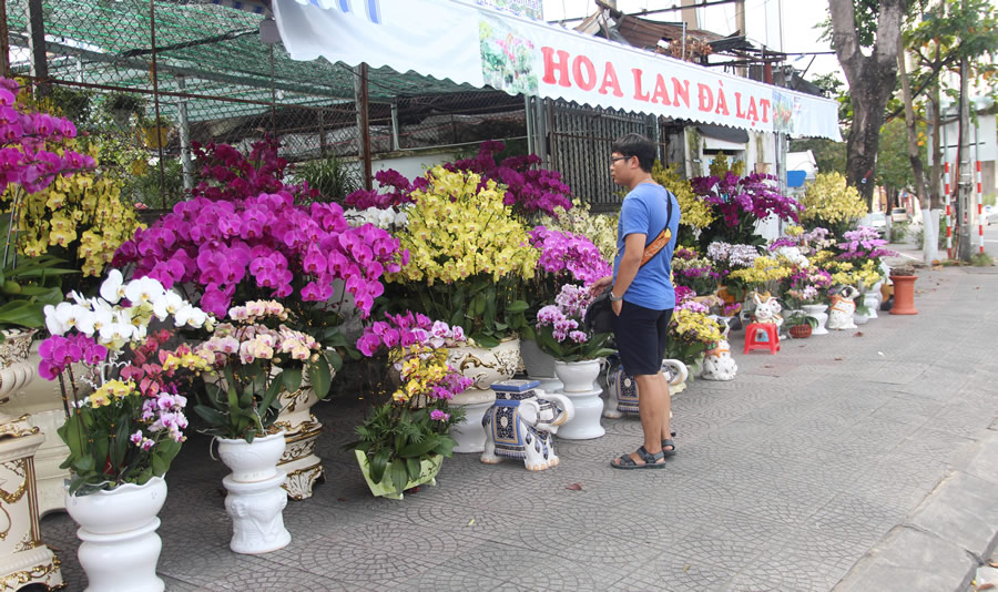 Bên cạnh truyền thống chơi hoa mai, quật cảnh, hoa cúc thì không ít khách hàng đang quan tâm đến hoa lan, đặc biệt là lan Hồ Điệp, mặc dù giá cả không hề rẻ. Đang loay hoay phun nước tưới vườn lan tại số 2 đường Trần Phú, anh Đoàn Nhơn, chủ vườn hoa bật mí, vườn hoa lan Hồ Điệp của anh được nhập từ Đà Lạt cách đây gần 1 tuần, đến thời điểm hiện tại đã bắt đầu có khách đến tìm mua. Lan Hồ Điệp có giá khá cao, như tại vườn nhà anh Nhơn có giá từ 2 triệu đến dưới 60 triệu/1 chậu nhưng vẫn có nhiều khách hàng quan tâm. Theo anh Nhơn, cách đây 1 ngày đã có một vị khách bỏ ra gần 20 triệu đồng để sở hữu 1 chậu lan độc đáo này. “Tuy đắt hơn so với nhiều loại hoa khác nhưng lan Hồ Điệp vẫn được nhiều khách lựa chọn bởi vì đây là loại hoa rất lâu tàn, dễ chăm sóc và có thể chơi được trong thời gian từ 2 đến 3 tháng”, anh Nhơn lý giải.