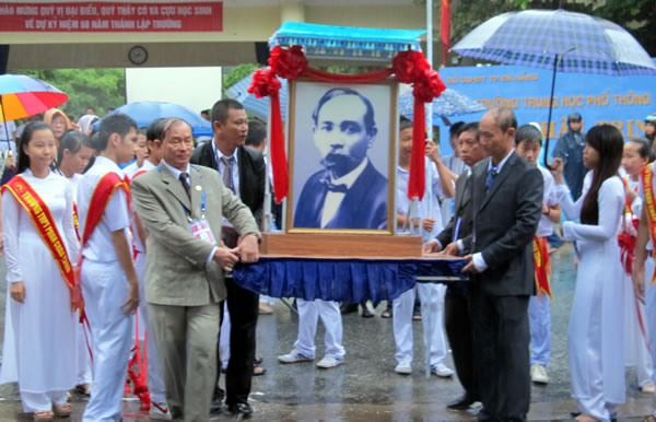 | Thầy trò Trường THPT Phan Châu Trinh rước di ảnh cụ Phan Châu Trinh về trường cũ trong lễ kỷ niệm 60 năm ngày thành lập trường năm 2015. |