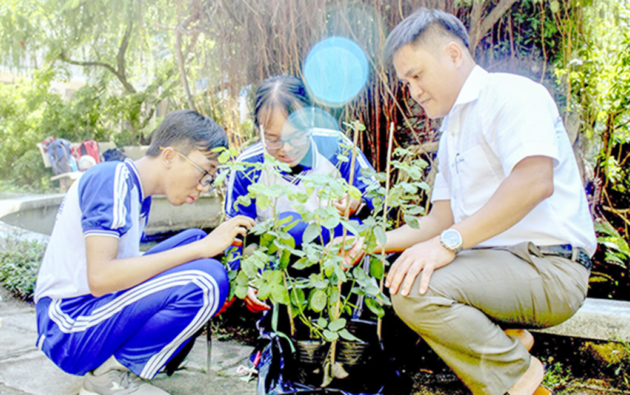 Thầy giáo hướng dẫn cùng Thái và Ngân nghiên cứu cây hoa hồng. |