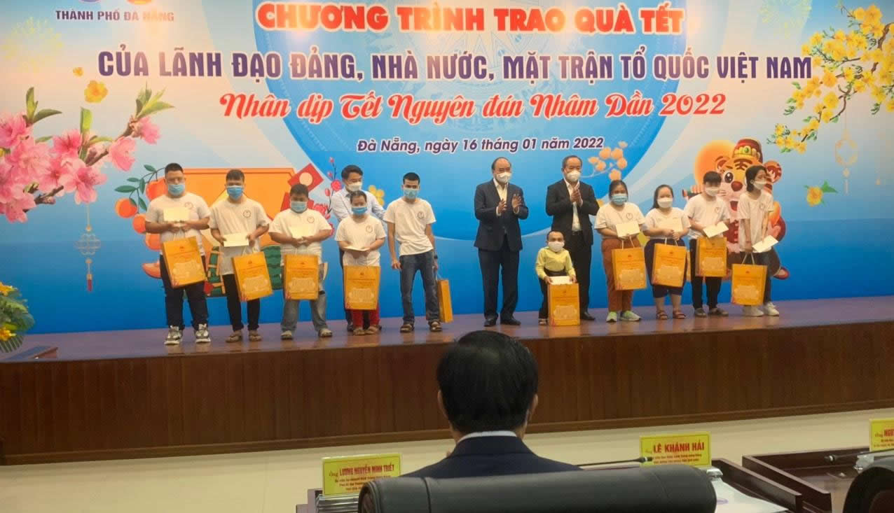 Trong ảnh: Chủ tịch nước Nguyễn Xuân Phúc tặng quà Tết cho nạn nhân chất độc da cam Đà Nẵng. |