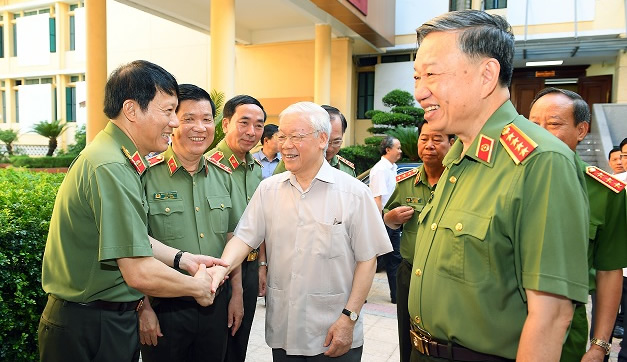 Tổng Bí thư, Chủ tịch nước Nguyễn Phú Trọng với các đồng chí Ủy viên Đảng ủy CAT.Ư, lãnh đạo Bộ CA. |
