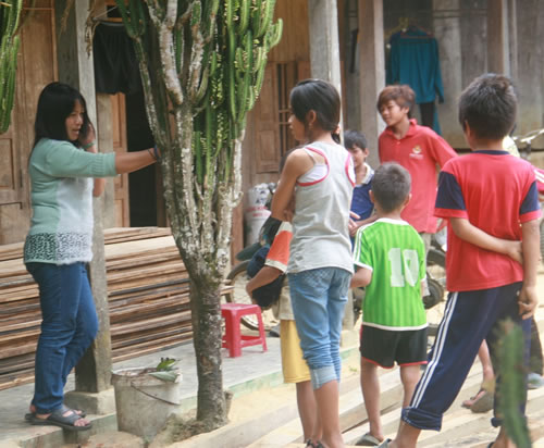 | Chị Hái gọi điện cho chồng nói bằng tiếng Trung Quốc khiến nhiều trẻ Bhnoong tò mò. |