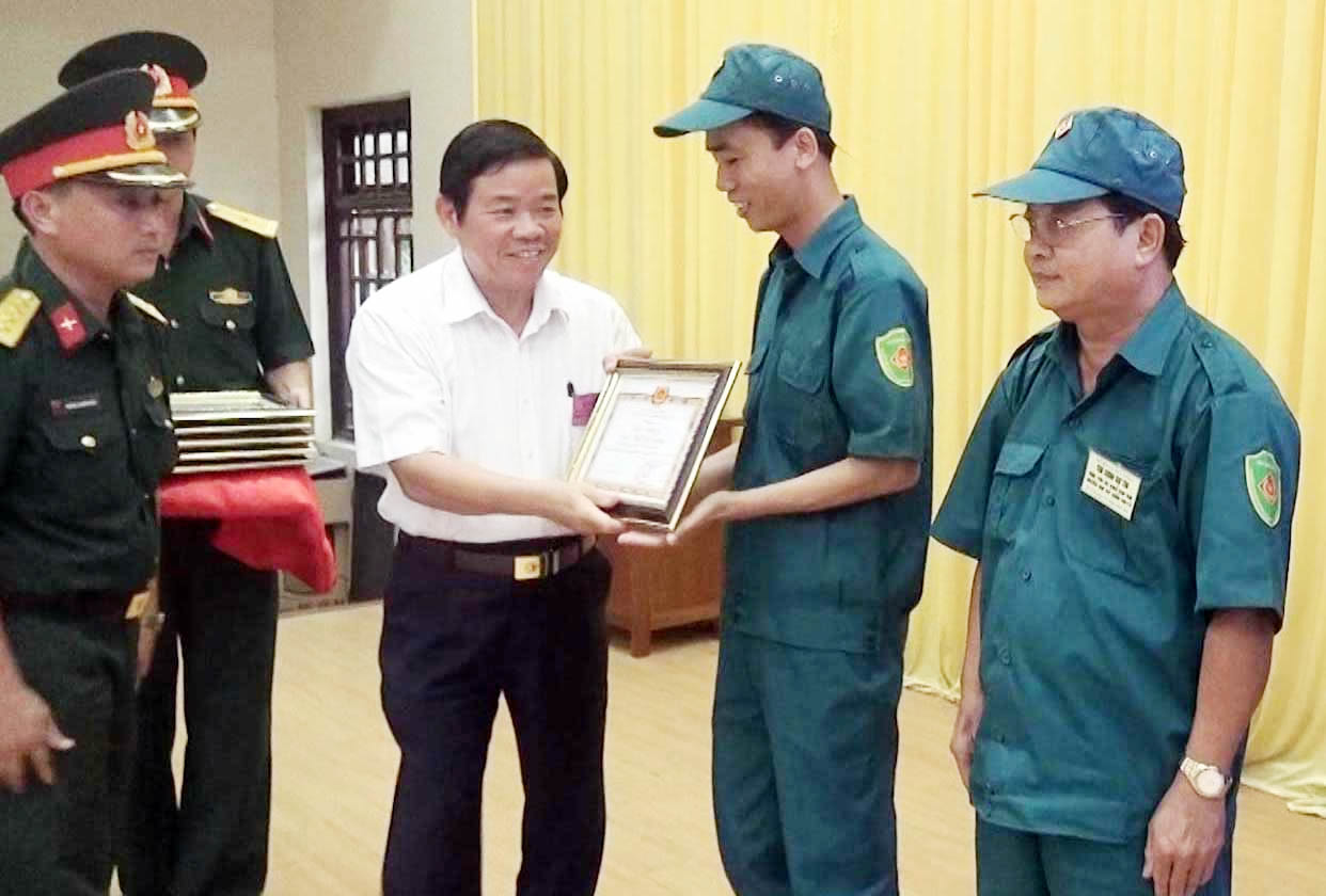 | Phó Bí thư Thường trực Huyện ủy Hòa Vang Nguyễn Thanh Hùng khen thưởng các Bí thư chi bộ Quân sự xã có thành tích xuất sắc. |