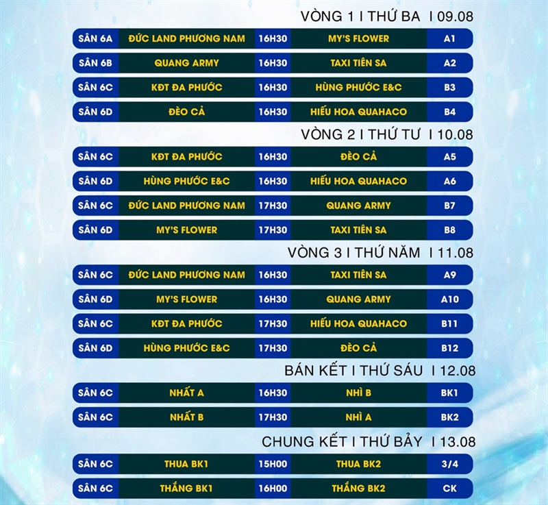 Sân 6C là cuộc thư hùng của 2 đội bóng lần đầu tham dự giải là Khu đô thị Đa Phước và Hùng Phước E&C. Đây cũng được xem là cặp đấu cân sức khi cả hai đều không có ngôi sao nào quá nổi bật nhưng đã từng vô địch ở nhiều giải đấu phong trào. Ở trận đấu còn lại trên sân 6D, nhà vô địch năm 2017 Hiếu Hoa Quahaco có vẻ “dễ thở” lượt trận mở màn khi gặp tân binh Đèo Cả. Đang trong giai đoạn trẻ hóa đội hình nhưng Hiếu Hoa Quahaco có lực lượng rất đồng đều và định hình lối đá bài bản từ nhiều năm qua. Dù đáng tiếc khi vắng mặt cầu thủ sở hữu danh hiệu “Bàn thắng đẹp nhất” FIFA Futsal World Cup 2021 Nguyễn Văn Hiếu do bận tập trung đội tuyển Futsal Việt Nam nhưng đội bóng của HLV Nguyễn Trọng Tùng vẫn còn những cái tên chất lượng, sẵn sàng tham gia cuộc đua vào vòng bán kết. Đối thủ của họ là Đèo Cả dù lần đầu tranh tài nhưng cũng mang đến giải lực lượng có chiều sâu, lối đá đồng đều ở các tuyến.