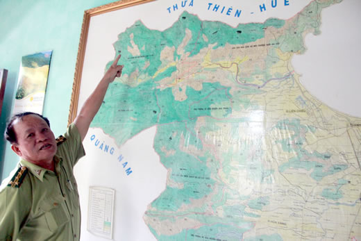 | Ông Trần Văn Lương – Chi cục trưởng Chi cục Kiểm lâm Đà Nẵng chỉ nơi phát hiện số lượng gỗ trái phép trên bản đồ. |