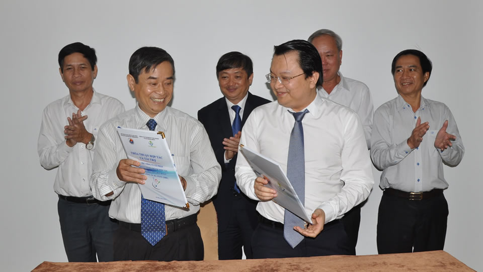 Dưới sự chứng kiến của lãnh đạo TP Đà Nẵng, đại diện lãnh đạo DBF và VN Đà Thành Group ký kết biên bản tài trợ. |