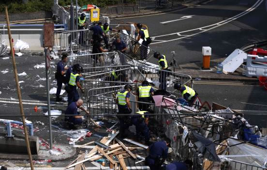 Cảnh sát phá bỏ rào chắn người biểu tình dựng ở trung tâm Hồng Kông. Ảnh: Reuters |
