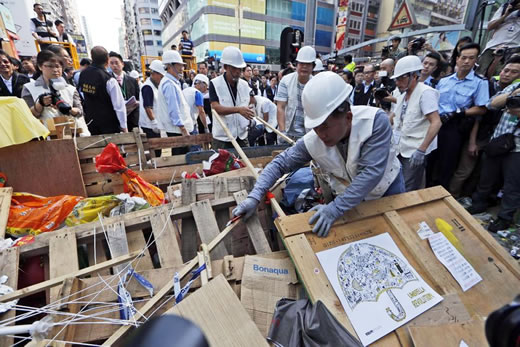 | Các nhân viên dọn rào chắn tại khu vực bị chiếm đóng ở quận Mong Kok. Ảnh: Reuters |