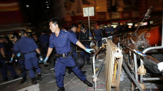 | Cảnh sát dỡ bỏ lều bạt của người biểu tình ở Mongkok ngày 17-10. Ảnh: Reuters |