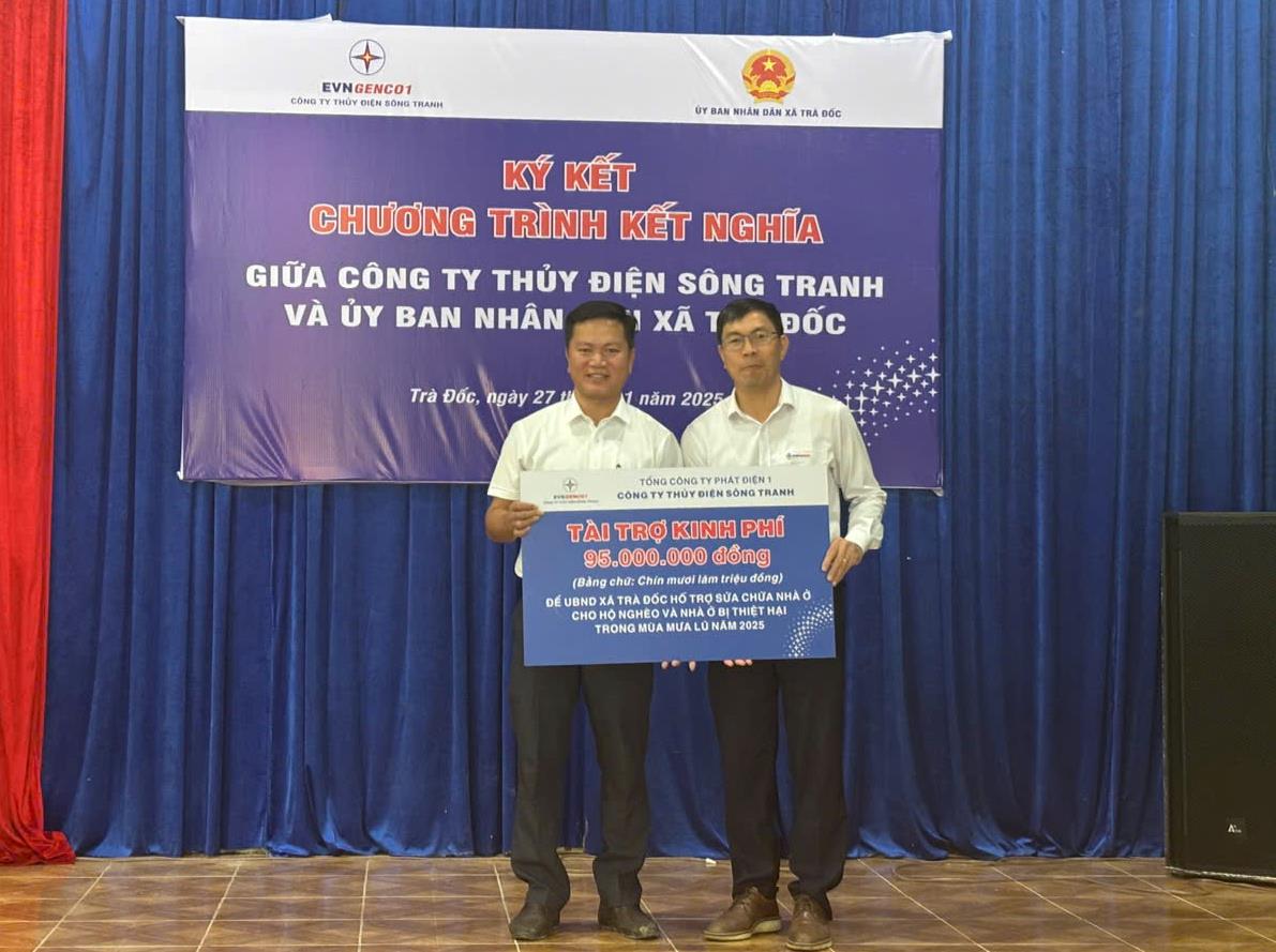 Tại Lễ ký kết, Công ty Thủy điện Sông Tranh hỗ trợ 95 triệu đồng để UBND xã Trà Đốc sửa chữa các căn nhà hư hỏng, dột nát của hộ nghèo và những hộ bị thiệt hại do thiên tai trong mùa mưa bão năm 2025. Đây là nguồn lực thiết thực giúp người dân sớm ổn định cuộc sống, góp phần khôi phục sinh kế sau mưa bão, đảm bảo an sinh xã hội tại địa phương.