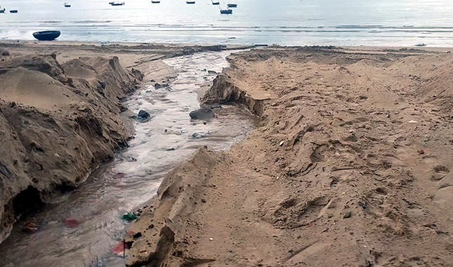 Đơn vị thi công đã cho máy bơm hút nước bẩn sau đó theo đường ống đổ thẳng ra biển kéo theo nhiều xà bần, gạch vụn, rác bẩn. |