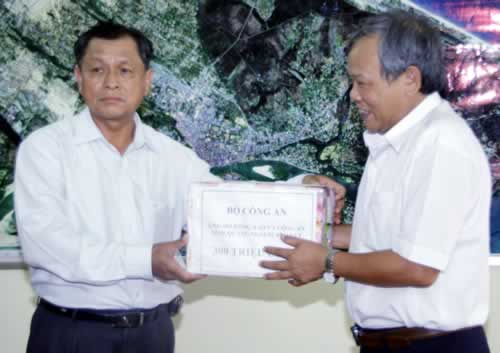 Thượng tướng Lê Thế Tiệm trao quà của Bộ CA ủng hộ đồng bào và CA tỉnh Quảng Ngãi bị bão lũ. |