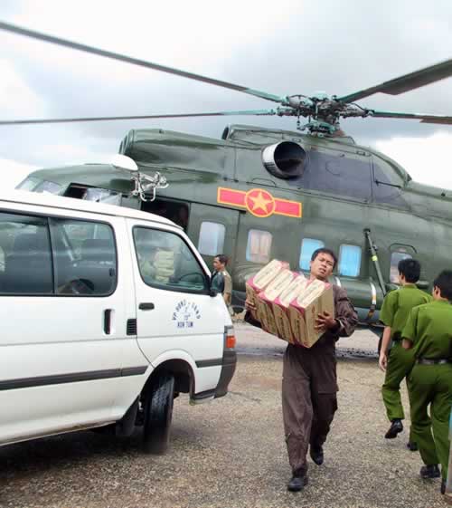 Vận chuyển hàng cứu trợ bằng trực thăng. Ảnh: D.H |
