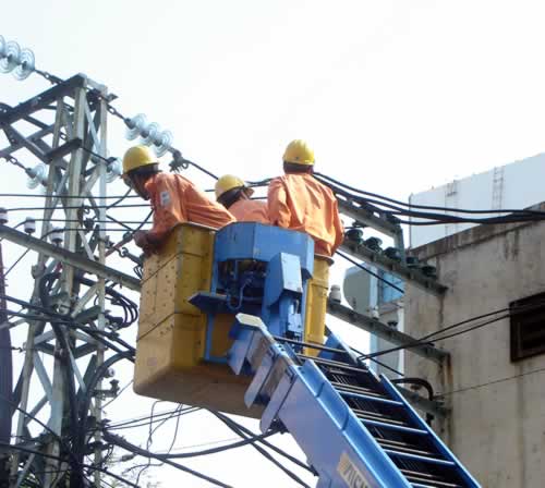 Khắc phục lưới điện sau lũ. Ảnh: P.KIẾM |