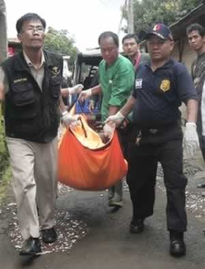 Cảnh sát khiêng thi thể được cho là của Dulmatin ra khỏi tòa nhà. |