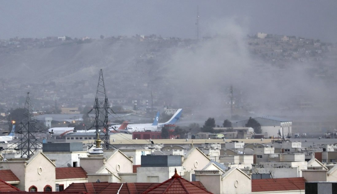 Khói bốc lên từ một vụ nổ bên ngoài sân bay ở Kabul. Ảnh: AP |