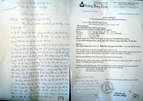 (1) Đơn khiếu nại của người dân gửi tới Báo Công an TP Đà Nẵng. (2) Có bản cam kết cùng lời hẹn kèm theo dưới góc nhưng anh Nguyễn Hữu Nam cũng như hàng chục khách hàng khác luôn bị hứa cuội, đặt cọc hơn nửa năm trời nhưng mỏi mắt vẫn không có Giấy chuyển nhượng quyền sử dụng đất. |