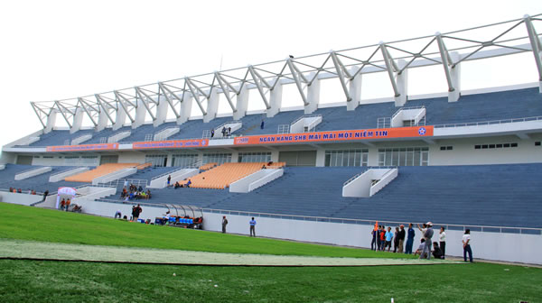 Khán đài A sân Hòa Xuân: Có thể nhìn thấy phần mái che chưa hoàn thành. Ảnh: Q.Hải |