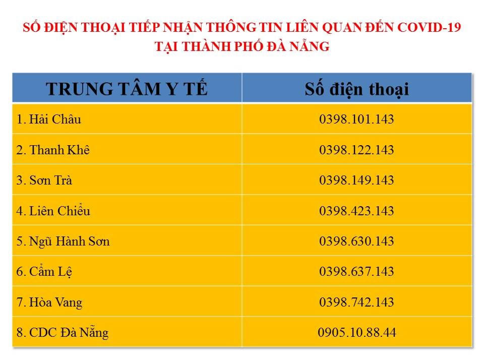 Trước tình hình nêu trên, Sở Y tế thành phố Đà Nẵng đề nghị tất cả những người mua bán, giao dịch, vận chuyển, lao động, từng đến Âu thuyền – Cảng cá Thọ Quang và Lò mổ Đà Sơn từ ngày 10/7/2021 đến nay khẩn trương liên hệ hoặc đến ngay cơ quan y tế địa phương khai báo y tế để được lấy mẫu xét nghiệm COVID-19, phát hiện sớm bệnh nhân COVID-19 để thành phố triển khai hiệu quả các biện pháp phòng, chống dịch. Chi tiết đường dây nóng của cơ quan y tế địa phương: