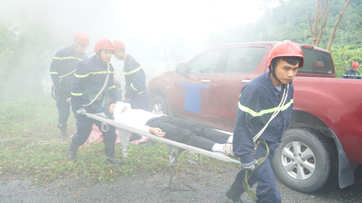 Dù thời tiết mưa gió, đường trơn và tầm nhìn hạn chế, lực lượng tham gia diễn tập vẫn kiên trì bám địa hình, phối hợp nhịp nhàng. Chỉ khoảng 10 phút sau khi tiếp cận, cả 3 nạn nhân được đưa lên vị trí an toàn và phương tiện dưới vực cũng được trục vớt.