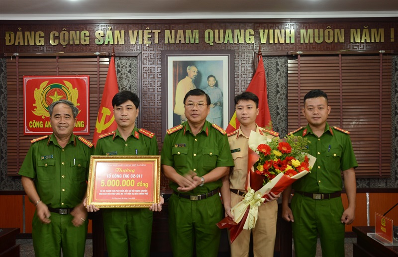 Dịp này, thừa ủy quyền của Chủ tịch UBND TP Đà Nẵng, Đại tá Trần Phòng đã trao thưởng đột xuất 5 triệu đồng cho tổ công tác C2-921 thuộc lực lượng 911 vì đã có thành tích xuất sắc trong công tác tuần tra, phòng chống tội phạm. Trước đó, rạng sáng 1-8, trong quá trình thực hiện nhiệm vụ chốt chặn tại địa bàn quận Hải Châu, tổ công tác đã phát hiện, bắt giữ đối tượng Trần Ngọc Khánh (1997, trú P. Chính Gián, Q, Thanh Khê) là đối tượng có 1 tiền án có hành vi mua bán trái phép chất ma túy; thu giữ 9 viên thuốc lắc, 2 gói chứa chất bột tinh thể màu trắng, bàn giao vụ việc và đối tượng cho CAQ Hải Châu tiếp tục điều tra, xác minh theo quy định.