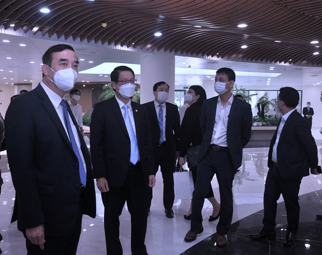 Bí thư Thành ủy Đà Nẵng Nguyễn Văn Quảng trao đổi với ông Huỳnh Đức Thơ- nguyên Chủ tịch TP- về kiến trúc công trình. Ảnh: P.Thủy