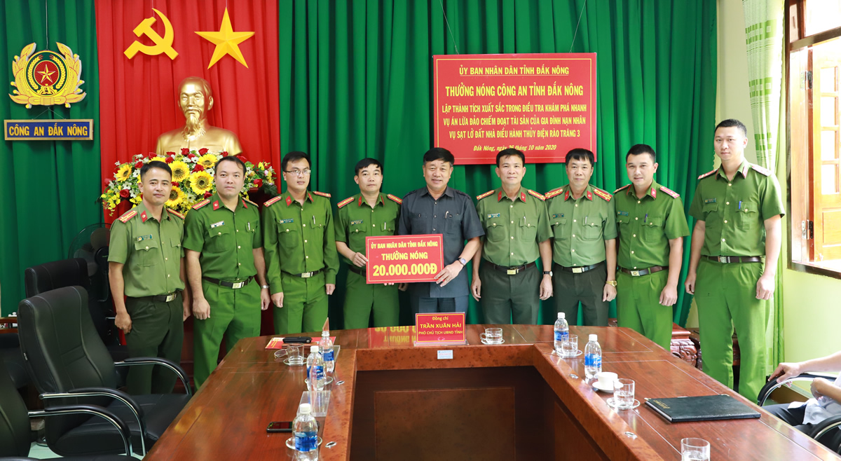 ĐẮK NÔNG - Phó Chủ tịch Thường trực UBND tỉnh Đắk Nông Trần Xuân Hải ngày 26-10 đến động viên và thưởng cho CA tỉnh Đắk Nông 20 triệu đồng vì thành tích xuất sắc trong việc khám phá nhanh vụ việc đối tượng sử dụng công nghệ cao để chiếm đoạt 100 triệu đồng tiền ủng hộ gia đình nạn nhân bị tử nạn tại sự cố sạt lở ở Thủy điện Rào Trăng 3 (tỉnh TT- Huế).