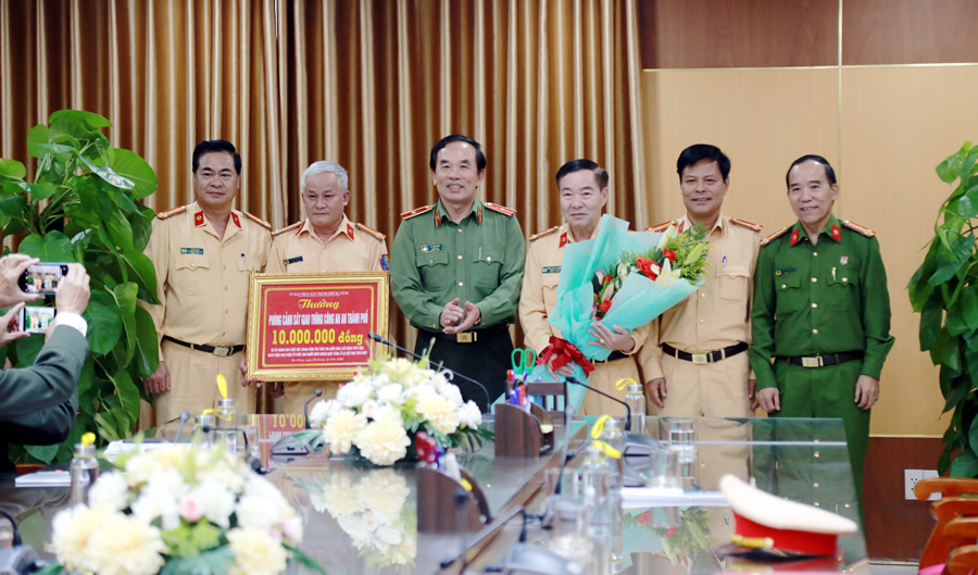 Thừa ủy quyền của Chủ tịch UBND TP, Thiếu tướng Vũ Xuân Viên trao thưởng cho lực lượng CSGT. |