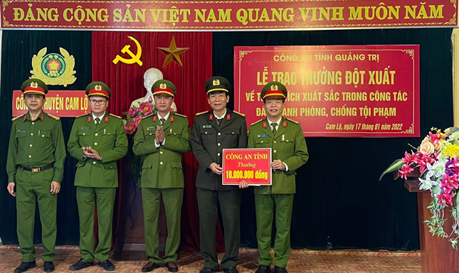 Ngày 17-1, Đại tá Trần Xuân Vĩnh- Phó Giám đốc Công an tỉnh Quảng Trị đã trao thưởng đột xuất cho CAH Cam Lộ vì đã có thành tích xuất sắc trong vụ bắt lô rượu lậu 1.500 chai, trị giá hơn 2 tỷ đồng. Trước đó, vào lúc 19 giờ ngày 13-1, tại khu vực bãi rác thuộc địa phận xã Cam Tuyền, H. Cam Lộ, lực lượng CAH phát hiện 2 ô-tô gắn BKS 74B - 000.25 và 43C - 058.65 đang giao nhận hàng hóa. Lực lượng Công an xác định những người này đang có hành vi vận chuyển hàng nhập lậu nên đã tiến hành bắt giữ và tổ chức khám xét phương tiện.