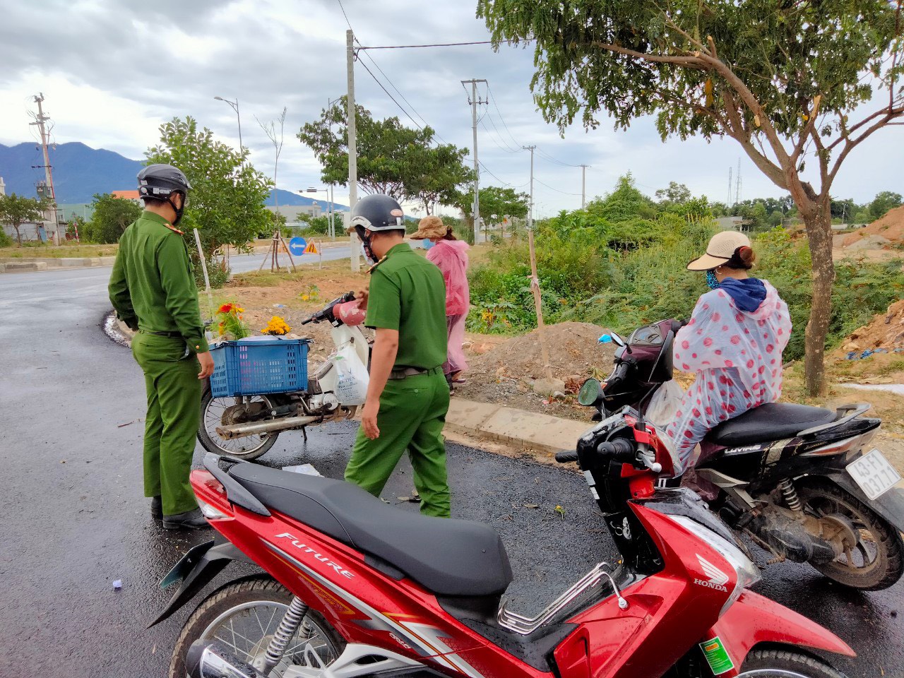Công an Hòa Phước nhắc nhở người dân đi lại, tụ tập đông người ngày 24-7-2021. |