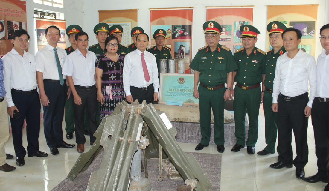 Các đại biểu chụp ảnh lưu niệm tham quan tại Khu trưng bày chứng tích chiến tranh của quân đội Mỹ tại sân bay A So. |