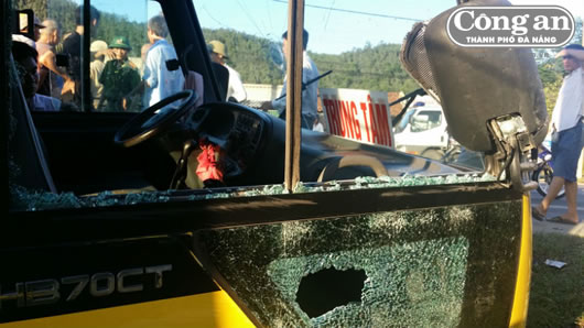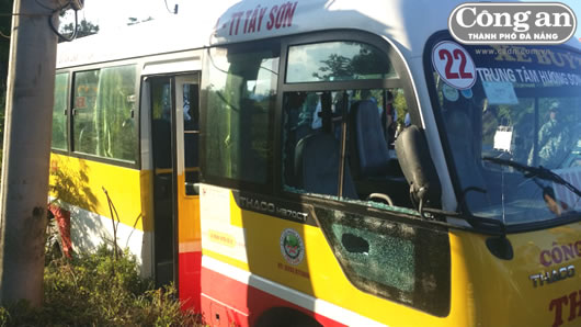 Kính xe buýt bị Phan Xuân Giáp lấy đá đập vỡ. |