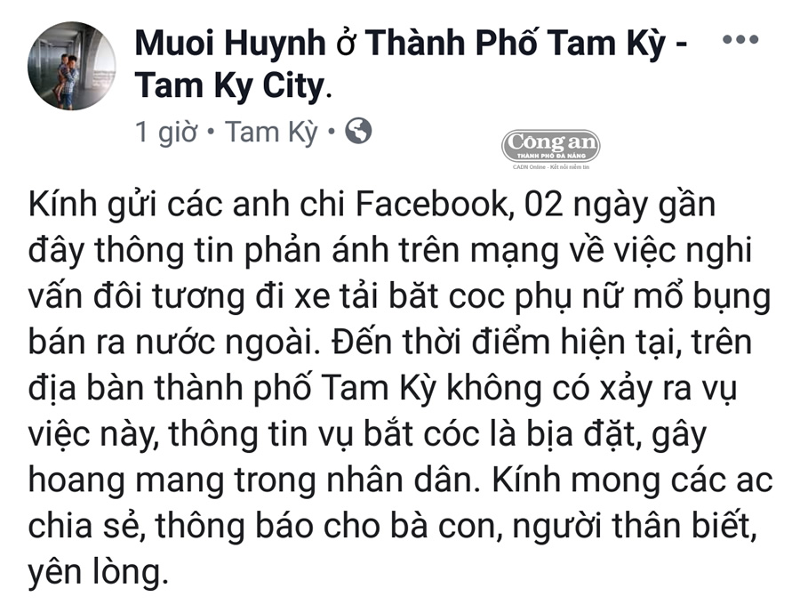 Trước tình hình trên, sau khi xác minh, Trung tá Huỳnh Tấn Mười - Phó trưởng CATP Tam Kỳ cũng đã bác bỏ lại thông tin liên quan đến việc “bắt cóc” trên lên facebook: “Kính gửi các anh chị facebook, 2 ngày gần đây thông tin phản ánh trên mạng về việc nghi vấn đối tượng đi xe tải bắt cóc phụ nữ mổ bụng bán ra nước ngoài. Đến thời điểm hiện tại, trên địa bàn TP Tam Kỳ không có xảy ra vụ việc này, thông tin vụ bắt cóc là bịa đặt, gây hoang mang trong nhân dân. Kính mong các anh chị chia sẻ, thông báo cho bà con, người thân biết, yên lòng”.