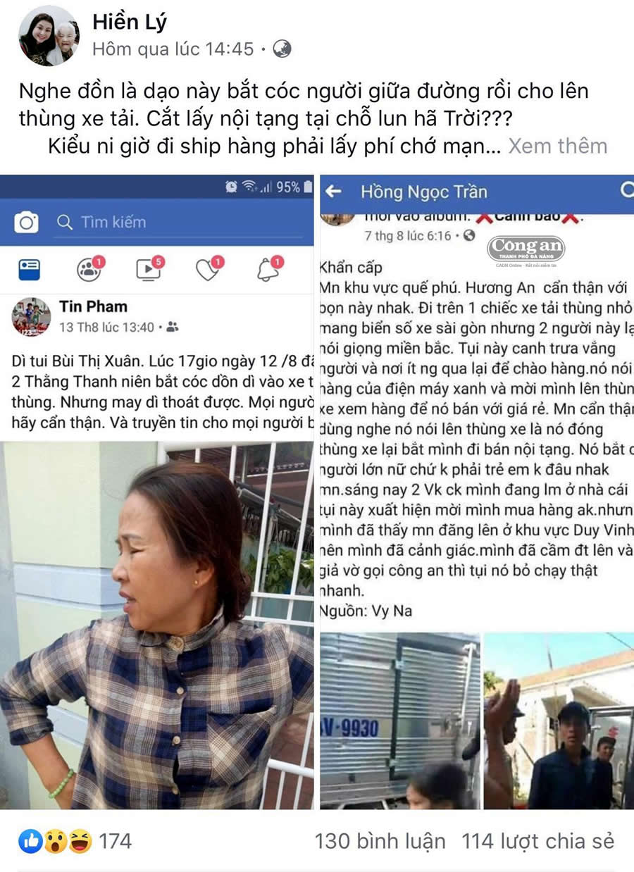 Trước đó vài ngày, nhiều trang facebook khác cũng đăng, chia sẻ những nội dung tương tự. Cụ thể như facebook “VyNa” đăng tải: “Mọi người khu vực Quế Phú, Hương An cẩn thận với bọn này nhá. Đi trên 1 chiếc xe tải thùng nhỏ mang biển số xe Sài Gòn nhưng 2 người này lại nói giọng miền Bắc. Tụi này canh trưa vắng người và nơi ít người qua lại để chào hàng. Nó nói hàng của Điện máy Xanh và mời mình lên thùng xe xem hàng để nó bán với giá rẻ. Mọi người cẩn thận đừng nghe nó nói lên thùng xe là nó đóng thùng xe lại bắt mình đi bán nội tạng. Nó bắt cả người lớn nữa chứ không phải trẻ em không đâu. Sáng nay 2 vợ chồng mình đang làm ở nhà cái tụi này xuất hiện mời mình mua hàng nhưng mình đã thấy mọi người đăng thông tin như trên ở khu vực Duy Vinh nên mình đã cảnh giác. Mình đã cầm điện thoại lên và giả vờ gọi Công an thì tụi nó bỏ chạy thật nhanh”...