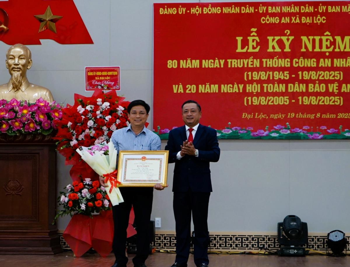 Ngày 19-8, UBND xã Đại Lộc, TP Đà Nẵng tổ chức lễ kỷ niệm 80 năm ngày truyền thống Công an nhân dân Việt Nam (19/8/1945-19/8/2025) và 20 năm ngày hội Toàn dân bảo vệ an ninh tổ quốc (19/8/2005-19/8/2025). Về dự lễ kỷ niệm có đại diện lãnh đạo các phòng thuộc CATP Đà Nẵng, lãnh đạo Đảng ủy, HĐND, UBND, tập thể CBCS CAX Đại Lộc, đại diên các tổ ANTT ở cơ sở, các chức sắc tôn giáo…