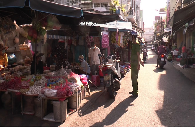 Lực lượng Cảnh sát khu vực tuyên truyền cho các tiểu thương không chủ quan dịch bệnh.
