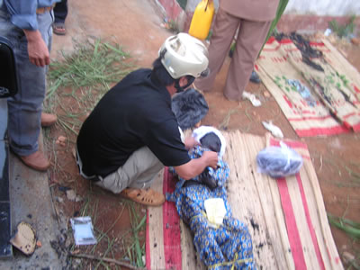 Thi thể cháu Huy được khâm liệm tại hiện trường. |