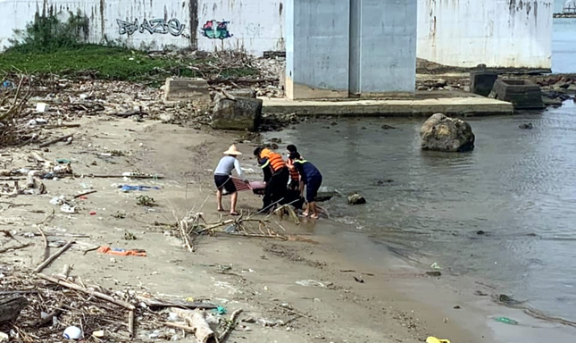 Lực lượng chức năng tìm kiếm và đưa một thi thể vào bờ.