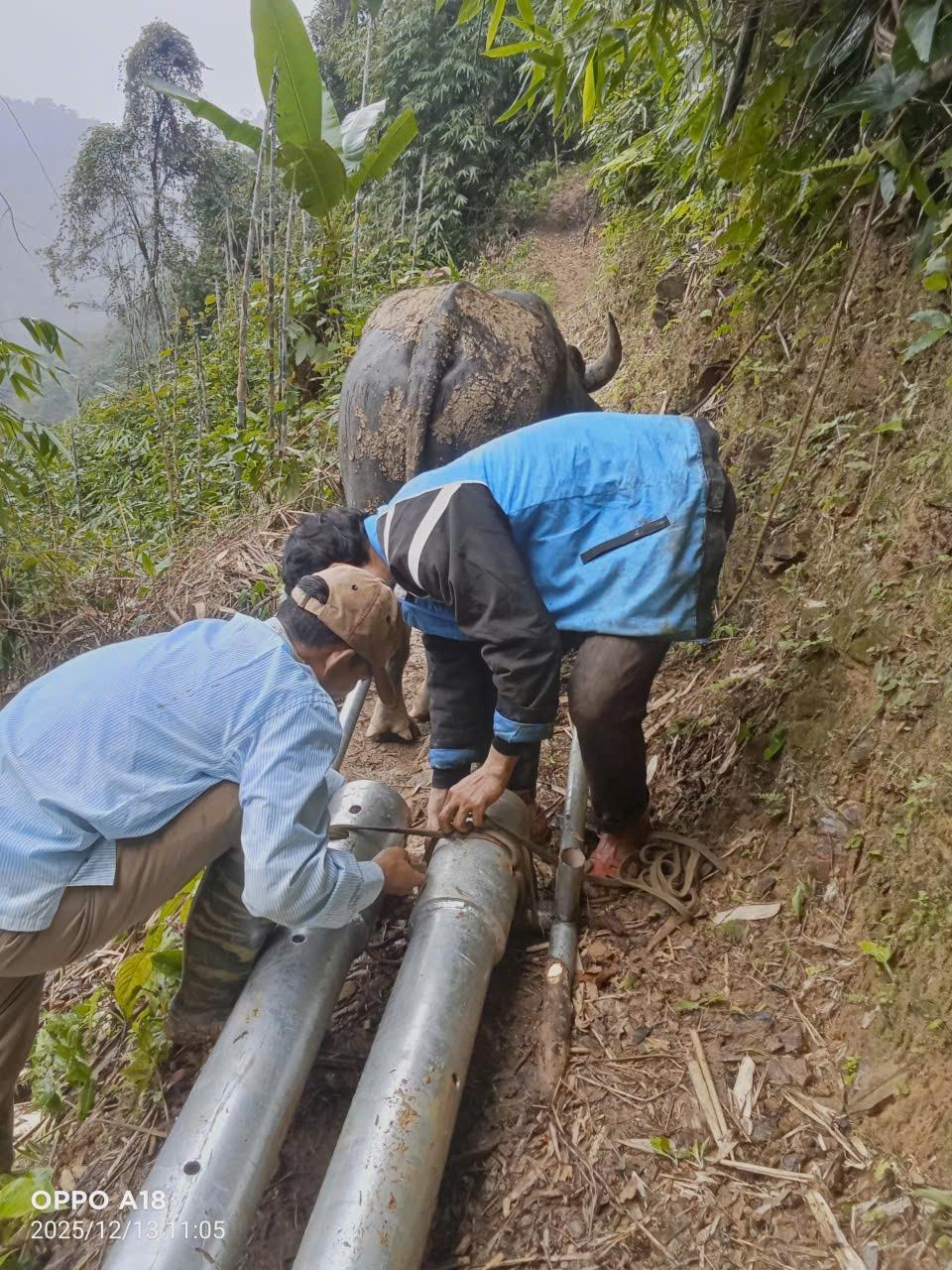 Dân làng dùng trâu kéo trang thiết bị lên làm hệ thống điện năng lượng mặt trời tại thôn Aur.