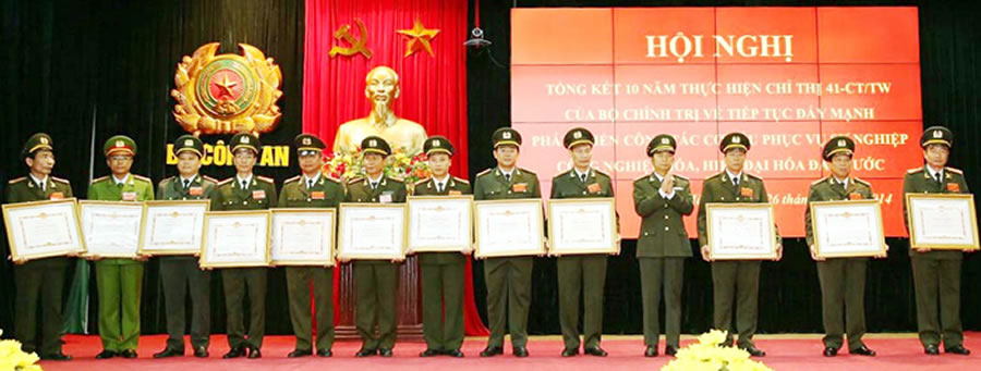 | Thượng tướng Đặng Văn Hiếu, Ủy viên T.Ư Đảng, Thứ trưởng Thường trực BCA tặng Bằng khen cho các tập thể có thành tích xuất sắc trong 10 năm (2004-2014) thực hiện Chỉ thị 41 của Bộ Chính trị về tiếp tục đẩy mạnh, phát triển công tác Cơ yếu phục vụ CNH-HĐH đất nước. (Trong ảnh: Đại tá Lê Thanh Hải, Phó Giám đốc CATP Đà Nẵng, thứ 5 từ trái qua nhận Bằng khen). |