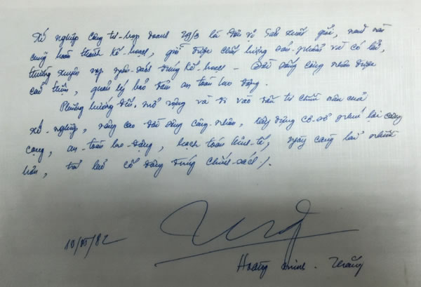 Bút tích của ông Hoàng Minh Thắng khi đến thăm Xí nghiệp Cty hợp doanh 29-3. |