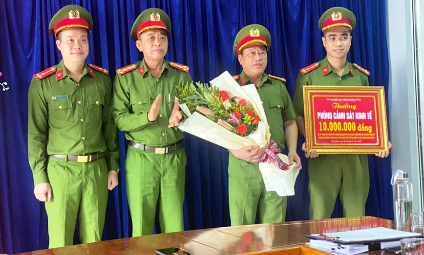Thừa ủy quyền của Chủ tịch UBND TP Đà Nẵng, Đại tá Trần Mưu trao thưởng cho Phòng Cảnh sát kinh tế trong công tác đấu tranh chuyên án. |