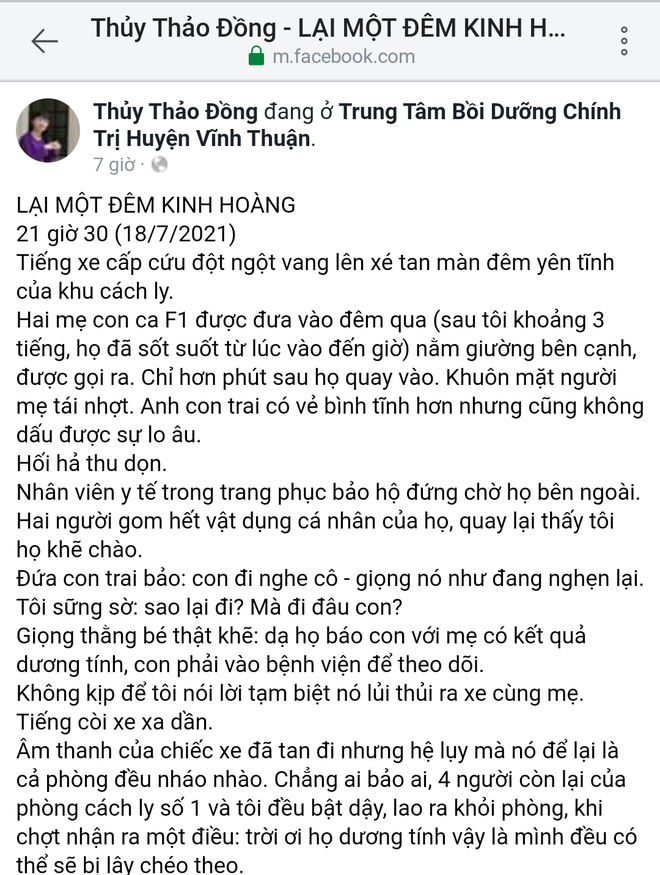 Trên trang cá nhân của cô Thảo, viết: "Âm thanh của chiếc xe đã tan đi nhưng hệ lụy mà nó để lại là cả phòng đều nháo nhào. Chẳng ai bảo ai, 4 người còn lại của phòng cách ly số 1 và tôi đều bật dậy, lao ra khỏi phòng, khi chợt nhận ra một điều: trời ơi họ dương tính vậy là mình đều có thể sẽ bị lây chéo theo.