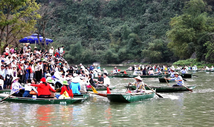 Cuộc hành trình của chúng tôi đến nơi đầu tiên là Tràng An cổ. Chiếc cổng nhỏ ghi hàng chữ: "Khu du lịch Tràng An cổ" đưa chúng tôi vào một khoảng sân nhỏ. Bên cạnh ngôi đền là dòng suối, đây cũng là bến thuyền cho cuộc hành trình khám phá hang động Tràng An khi du khách tìm đến nơi này. Những chiếc thuyền nhỏ chở được 10 người sẽ đưa bạn lênh đênh trên sóng nước, khám phá hang động trong vòng 30ha trong tổng diện tích 2.000ha toàn khu vực Tràng An.