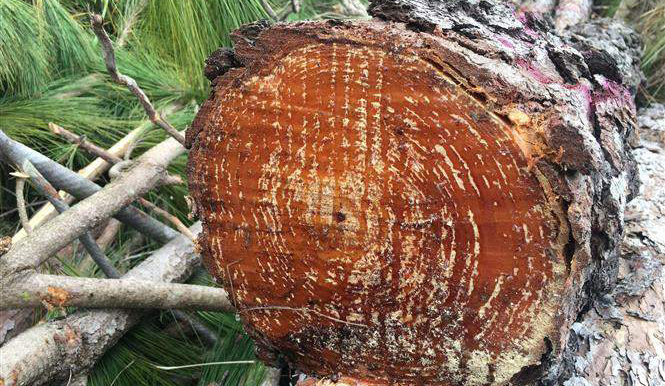 Nhựa thông vẫn còn chảy trên thân cây mới bị cưa hạ. |