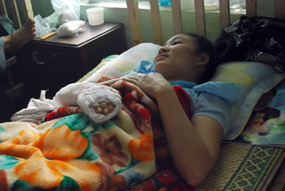Chị Nguyễn Thị Hà điều trị với vết chém gãy bàn tay phải. |
