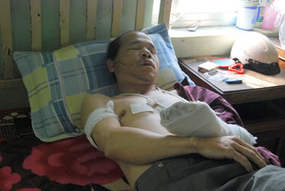 Ông Phạm Hồng Lâm điều trị tại bệnh viện với hàng loạt vết chém trên cơ thể. |