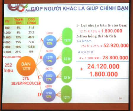 Buổi chiều cuối năm Nhâm Thìn, tôi chen chân theo dòng người hối hả bước vào “đại bản doanh” – trụ sở Cty Amway, số 169 – 171 Nguyễn Văn Linh, Đà Nẵng. Già trẻ có cả, nhưng chủ yếu là cánh học sinh, sinh viên, người chưa có công ăn việc làm ổn định. Cảnh giao dịch mua bán hàng liên tục diễn ra như buổi chợ phiên. Tôi ngỏ lời với một nữ sinh (sau này cô giới thiệu là sinh viên một trường y) rằng muốn tham gia mạng lưới Amway, lập tức cô bé áp sát, nhanh nhảu: “Anh muốn làm việc cho Amway à? Anh đã có người giới thiệu vào làm chưa, nếu chưa em tư vấn cho, đảm bảo thích liền”. “Chưa ai giới thiệu. Anh đang làm thị trường cho một Cty thực phẩm chuyên về đồ hộp, nhưng lương kém quá. Nghe bảo làm ở đây khá lắm nên tìm đến “– tôi đáp. Cô bé cười phấn khởi rồi nhấc điện thoại điện cho một nhà phân phối (NPP) tên Q. trong mạng lưới của mình: “Chị Q. à, có một anh muốn nhập nhóm, chị ở nhà hay ở Cty, có thể đến giới thiệu cho anh ấy được không”. Cô bé cúp máy chưa được 15 phút thì Q. xuất hiện, tiếp cận tôi cùng những tràng liến thoắng sau lời chào xã giao. Nào là: Anh đã biết gì về Amway? Anh từng đọc tài liệu gì nói về Amway chưa? Anh làm thị trường cho Cty bán hàng đồ hộp lương cao hay thấp? Tôi lắc đầu: Mới đến đây lần đầu. Chỗ Cty đang làm lương chán lắm, được 5 triệu đồng/tháng nhưng áp lực vô cùng. Nghe đến đây, Q. bắt đầu khoe mẽ, tâng bốc Amway và “nổ” về công việc của mình. Theo Q., Amway là số một về thương hiệu và rất có trách nhiệm với cán bộ, nhân viên tham gia mạng lưới. Như các ngành khác, khi đi khỏi ngành mọi quyền lợi không còn thuộc về mình, nhưng với Amway trái lại, quyền sở hữu của mình vẫn là mãi mãi. Bởi Amway luôn luôn tính doanh số vào nhóm của mình để trả thưởng. Ví như, một cây bút mua từ Amway 19.500 đồng, Cty quy đổi lại cho khách hàng 1 điểm. Cứ thế, nếu đạt doanh số 10.000 điểm (tức thứ hạng Platinum), Cty sẽ chiết khấu lại 21% số tiền bán hàng cho khách hàng tham gia mạng lưới; 7.000 điểm, được 18%; 4.000 là 15%. Bắt đầu từ trên 600 điểm sẽ trở thành NPP chính thức. Ngoài khoản hoa hồng này, nếu khách hàng mời được thêm nhiều người khác vào nhóm của mình và doanh số cả nhóm đạt 10.000 điểm (194 triệu đồng) thì mình được hưởng % từ họ lên đến hàng chục triệu.