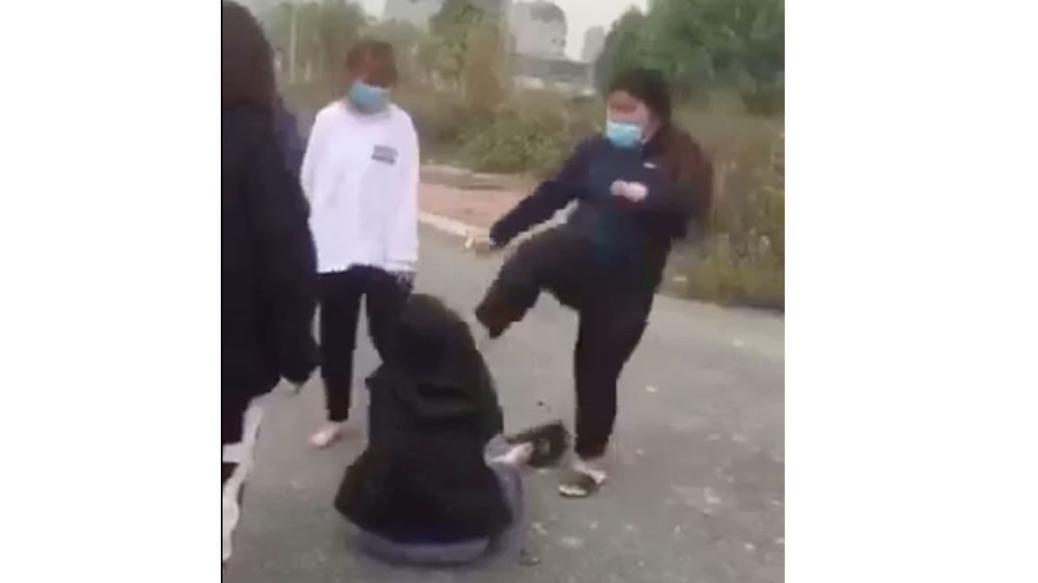 Hình ảnh cắt từ clip cho thấy nhóm nữ sinh bạo hành 2 em học sinh nữ lớp 8 và 9 trường THCS Phú Cường ở Hà Đông, Hà Nội hôm 26-12-2020. |